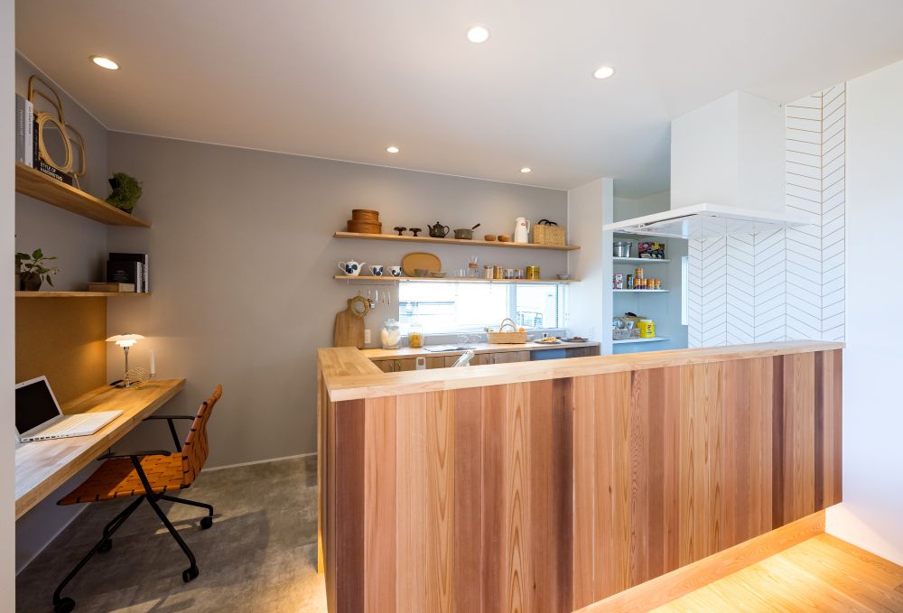 キッチン横のスタディスペースは、家族の距離をほどよく近づけてくれる場所。