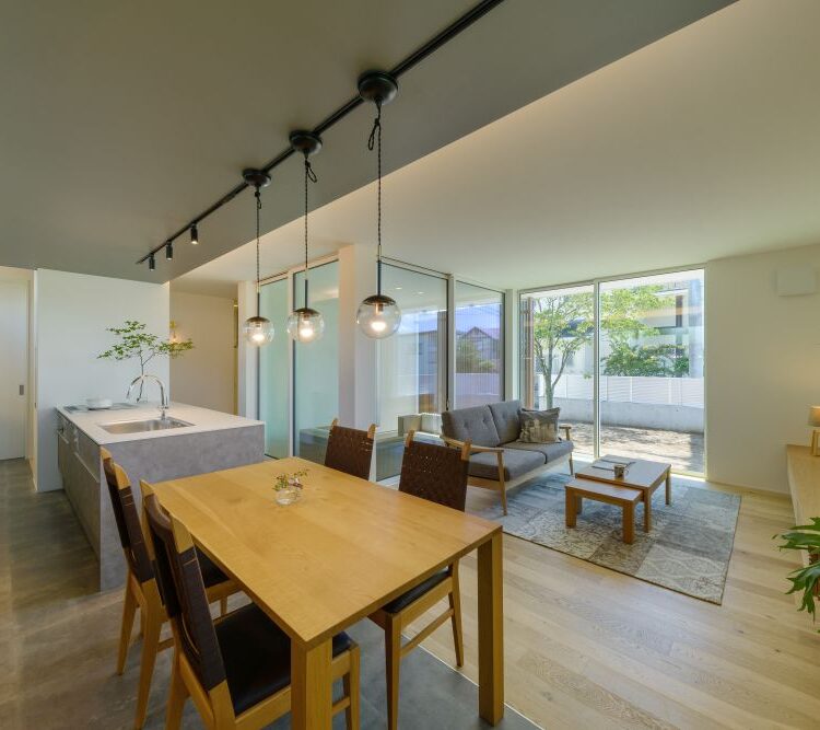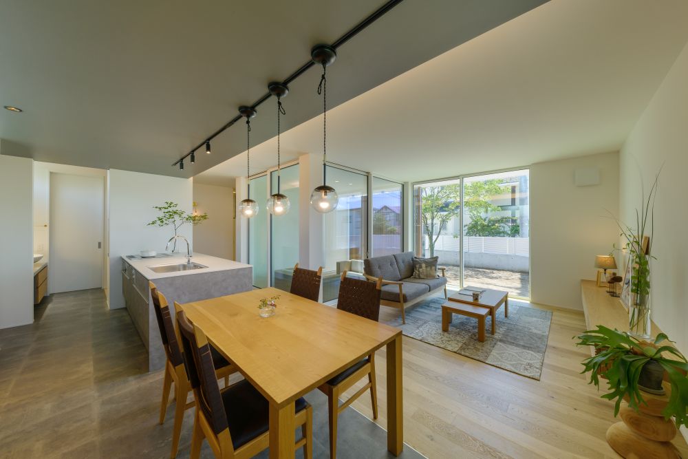 リビングからダイニング、キッチンまでがひと続きとなったレイアウトは、空間に一体感を持たせ、