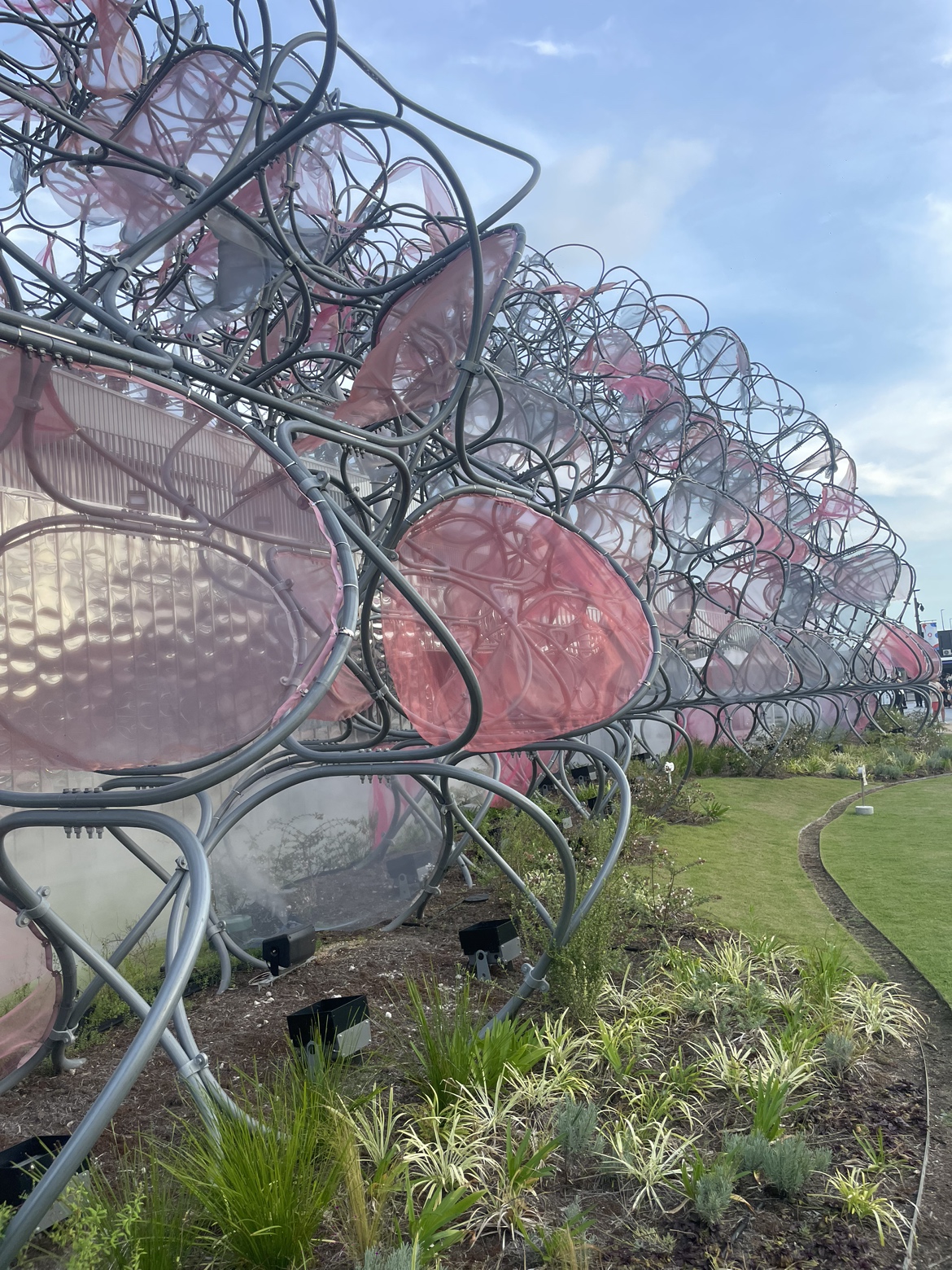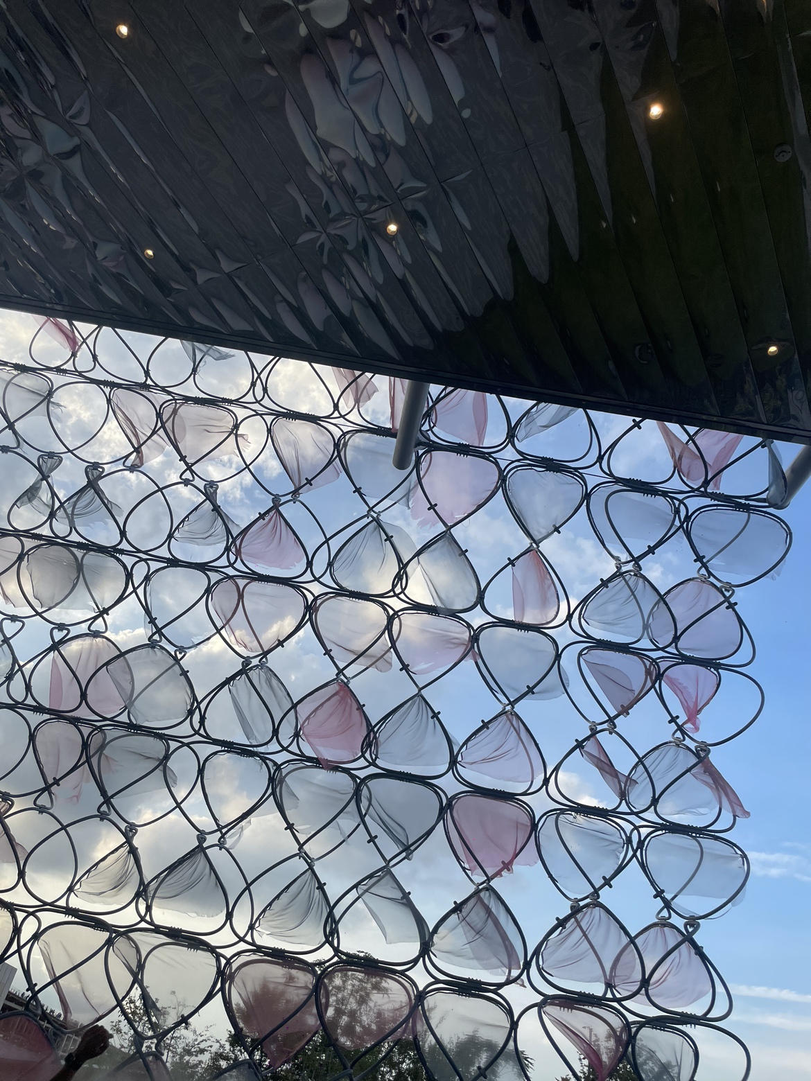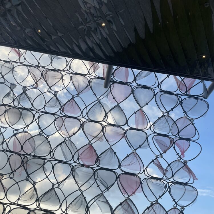永山氏がデザインされた有機的で幻想的な外観は、「循環」を象徴するモチーフを原単位とし、約1,400個を組み合わせて形成されています。モチーフは直径1.0m〜1.5mの4種類で構成され、鉄製のフレームに薄いオーガンジーを張ることで、風に揺れ、光を透かし、常に違った表情を見せてくれます。